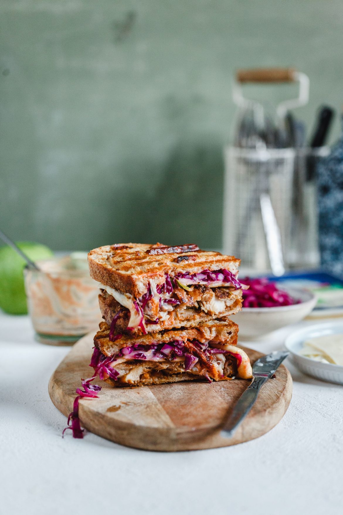 Szeretem ezeket a tartalmas, jól összerakott melegszendvicseket, amik tényleg felérnek egy teljes fogással. Ebben a csirkés reubenben a következő rétegek rejtőznek: egy szelet kenyér, kívül vajjal megkenve, belül egy speckó szósz (leírom a receptben), után jön egy roston sült csirkecomb-filé, néhány szelet vékonyra szeletelt zöldalma, gyors, savanyított lilakáposzta és sok-sok tilsiter sajt. Pár perc a grillsütőben, hogy szépen megolvadjon a sajt és összeérjenek az ízek, aztán már kész is.
