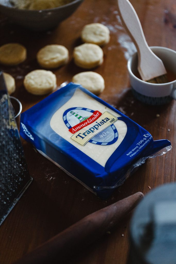 A lisztet, az élesztőt és a sót szitáld egy tálba, majd reszeld bele a hideg vajat és az egészet dolgozd össze, amíg morzsalékos nem lesz. A tejfölben keverd el a tojás sárgáját, öntsd a tésztához, valamint add hozzá a tejet is és dolgozd simára. Legvégül keverd bele a reszelt sajtot is.