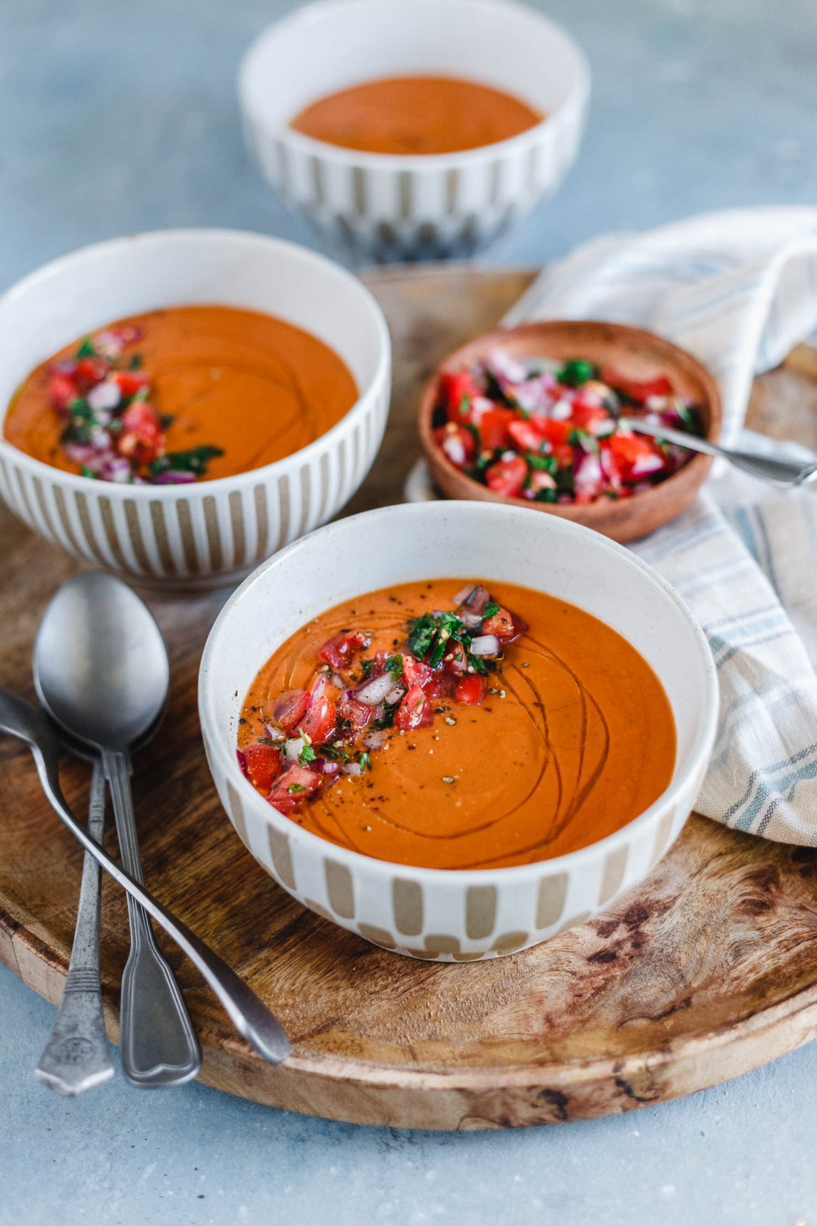 Készülhet csak kápiából is (amihez adhattok málnát is, isteni lesz) vagy a paradicsom egy része helyettesíthető görögdinnyével. Bármelyiket is választjátok, egy a lényeg: hűtsétek be rendesen! Segít összekovácsolni az ízeket is, na meg így a legjobb kanalazni a hőségben is.
