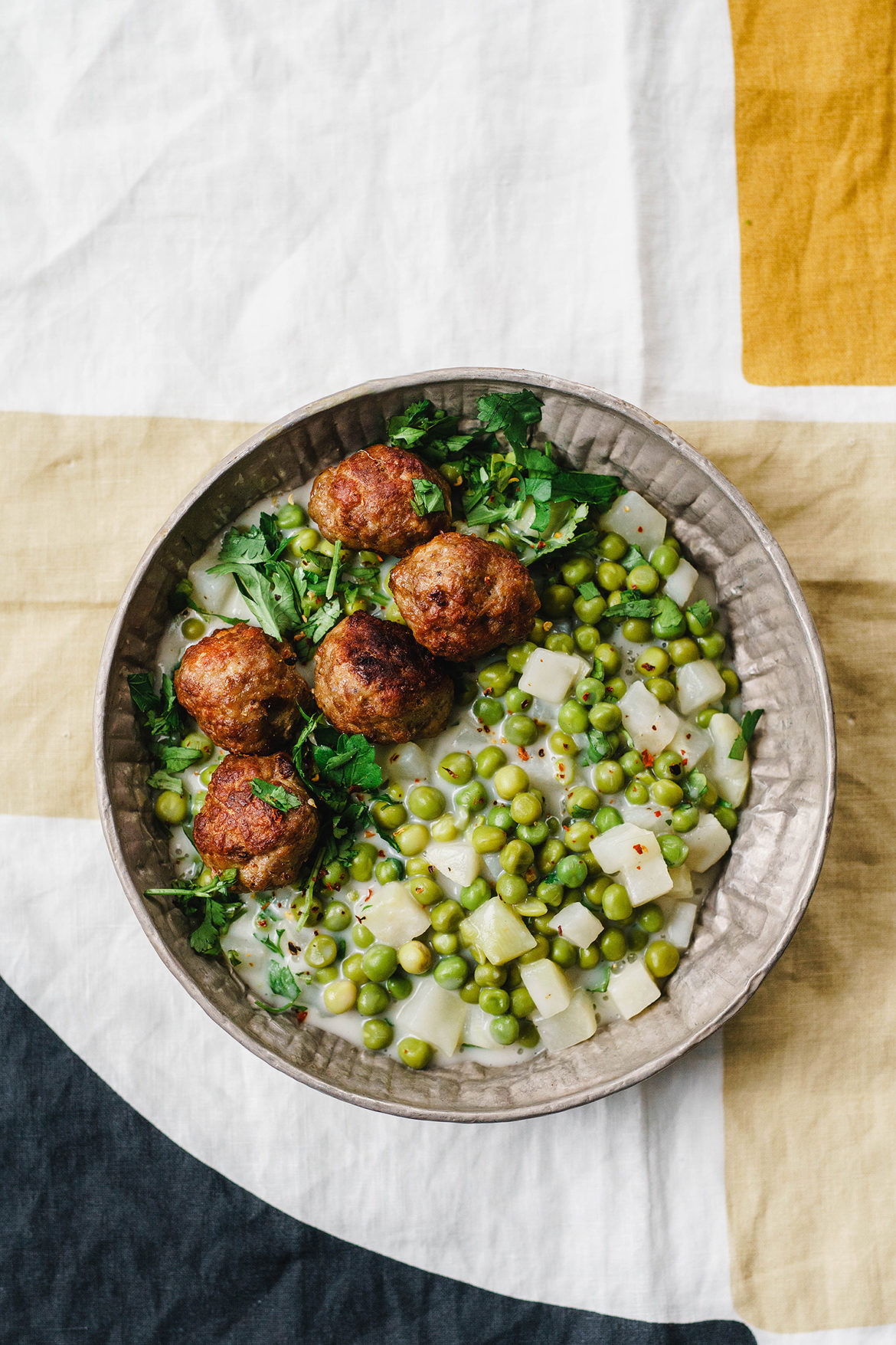 Kókusztejes zöldborsófőzelék citromos húsgolyókkal
