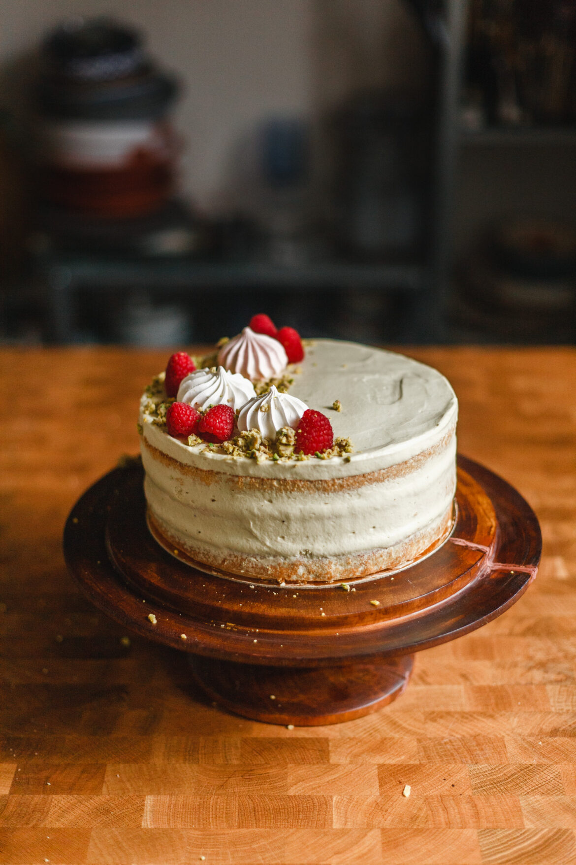 Gyönyörű pasztellzöld színű, mert a torta bevonáshoz is ezt a pisztáciás krémet használtam fel. Mivel nincs szezonja ezért csak díszítésnek használtam hozzá málnát, plusz még maradék habcsókokat, amit a kamrában találtam. Nem is kell szerintem túlbonyolítani.
