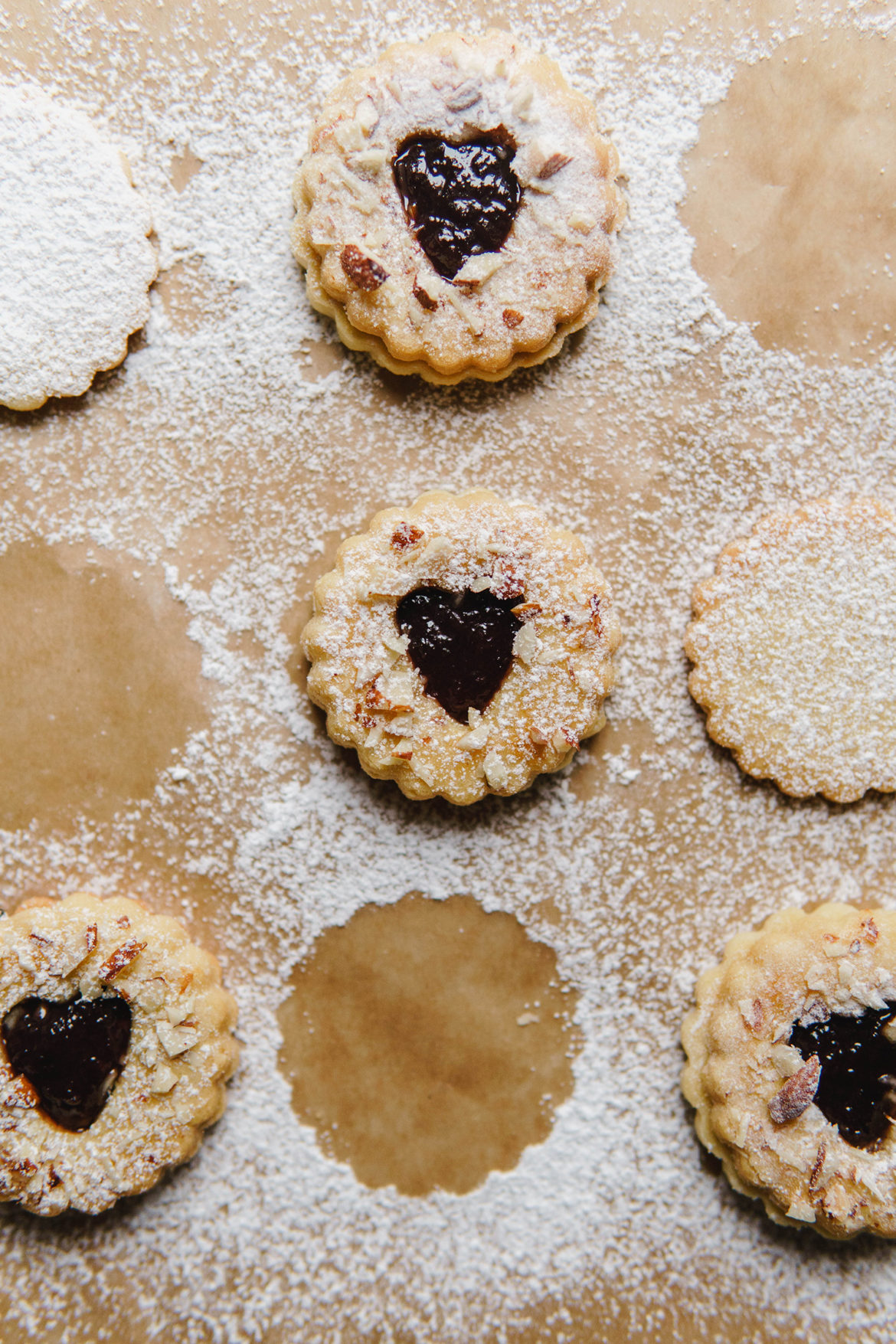 A pihentetett tésztát vékonyan lisztezett felületen 3-4 mm vastagságúra kinyújtjuk, majd kiszaggatjuk. Minden második közepébe egy kis szív szaggatóval lyukat csinálunk és ezeket lekenjük tojásfehérjével, majd megszórjuk aprított mandulával.