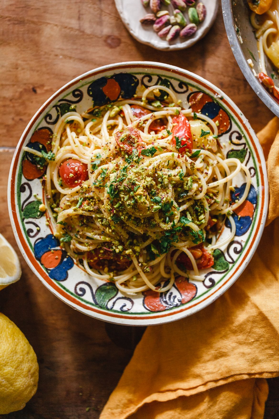 A recept okossága a szószban rejlik, hiszen a vaj és a paradicsomlé emulziója adja az alapját, ez van továbbgazdagítva sajttal és a tészta főzővizével, hogy aztán egy selymes köntös kerekedjen a spagettik köré. Az ízesítő még egy kanál frissen tört pisztácia és tényleg ez a pár hozzávaló elég is ahhoz, hogy egy pillanatra Olaszországban érezze magát az ember.