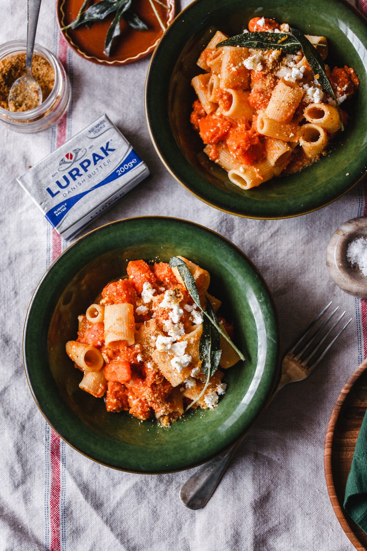 De haladjuk csak szép sorban, elsőnek ezzel a sütőtökös tésztával. Az benne az okosság, hogy egyrészt a vajban ropogósra sütött zsálya ízesíti, másrészt, hogy aztán ebben a vajban, szép lassan párolódik a tök és ahogy a puhul, szinte elolvadnak benne a zöldségkockák, így sűrűsíti be a szószt. Úgyhogy nem is kell bele se tejszín, se liszt. Persze egy kis reszelt parmezánnal ezt sem lehet elrontani vagy egy adag friss kecskesajttal, ami nekem volt itthon. A tetejére szórtam egy adag fűszeres kenyérmorzsát, de ez már egy másik történet, nemsokára azt is elmesélem.